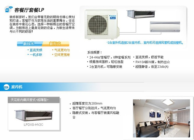 1臺室外機連接2臺室內機,室內機可選擇風管式室內機或掛壁式室內機,靈活對應